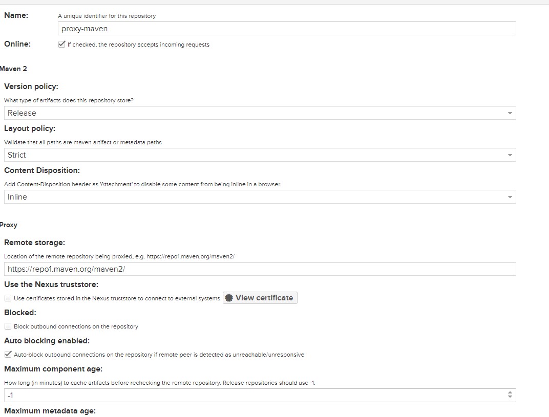 Name: proxy-mavenMaven 2: 不设置,使用默认。ProxyRemote Storage: 远程仓库地址,这里填写: Central Repository: (opens new window)