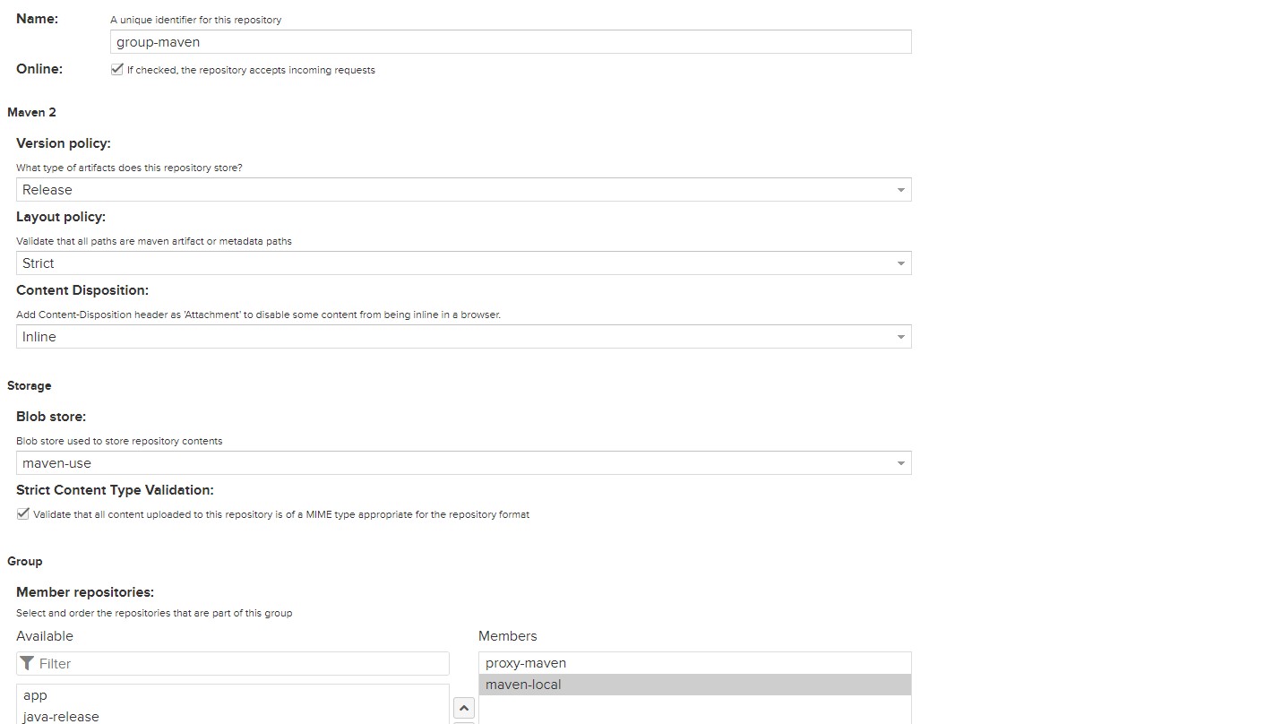 Name:group-mavenStorage:选择专用的blob存储maven-use。group: 将左边可选的2个仓库,添加到右边的members下。