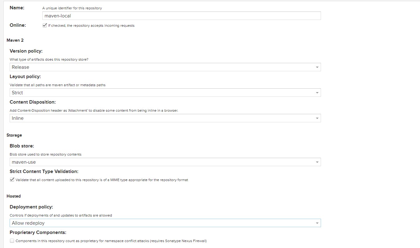 Name: 定义一个名称maven-localOnline: 勾选。这个开关可以设置这个maven repo是在线还是离线。Maven2:这里有三种方式,Releases、SNAPSHOT、Mixed。- Releases: 一般是已经发布的Jar包