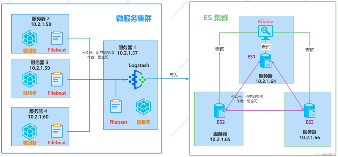 - 其中一台服务器安装 Logstash ,Filebeat 发送日志给 Logstash。Logstash 将日志输出到 Elasticsearch集群中。