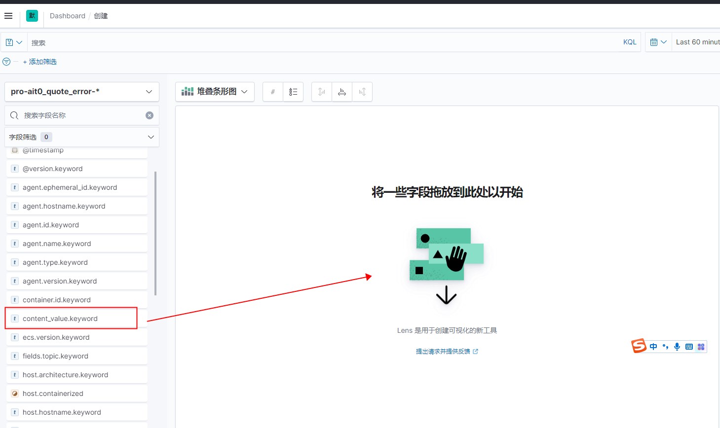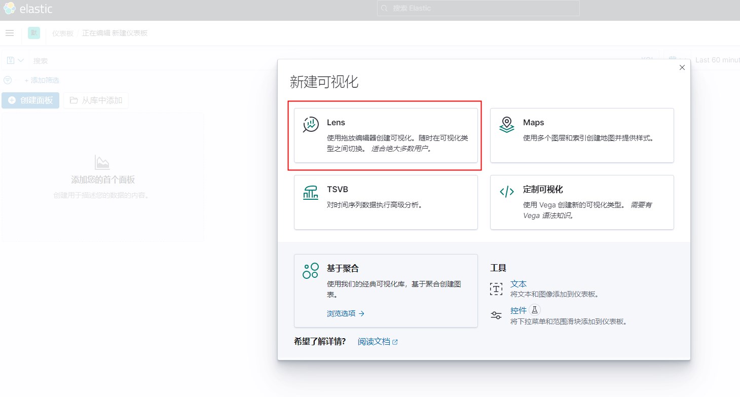 # 打开dashboard仪表盘,创建仪表盘,创建面板,选择可视化lens