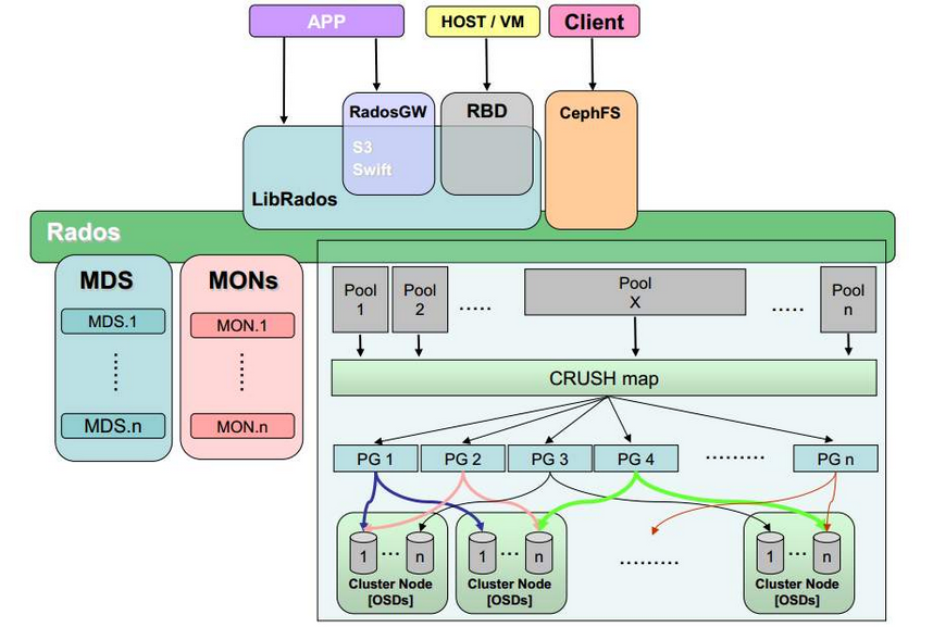 - LIBRADOS应用: 通俗的说,Librados提供了应用程序对RADOS的直接访问,目前Librados已经提供了对C、C++、Java、Python、Ruby和PHP的支持。它支持单个单项的原子操作,如同时更新数据和属性、CAS操作,同时有对象粒度的快照操作。它的实现是基于RADOS的插件API,也就是在RADOS上运行的封装库。