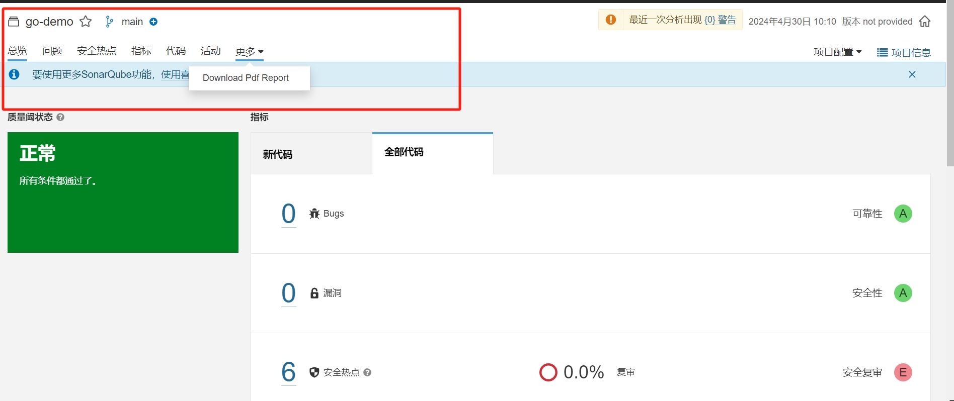 点击项目下"更多 -->> Download Pdf Report",(对原有项目进行sonar扫描后才能输出pdf,之前的扫描结果不能输出pdf)